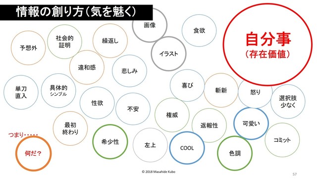 いかがでしたか、記号消費という手法は、消費者に「瞬間的に」「意識を向けさせる(気を引く)」効果が期待できます。ヒト(人)は、五感を経て、意識的に情報を処理しているのは、たったの00036%のみです。気を引いて、意識を向けさせることができなければ、皆さんの商品やサービスの良さを伝える機会すら得られないのです。逆に気を引き、注目さえしてもらえれば、かなりの高確率で、自社の商品やサービスの良さを伝えることが可能になります。